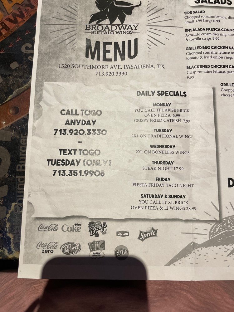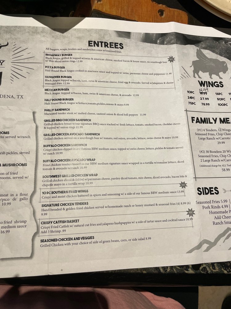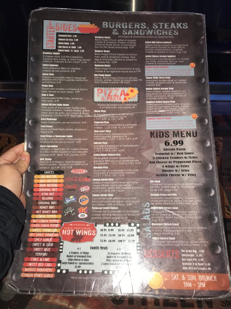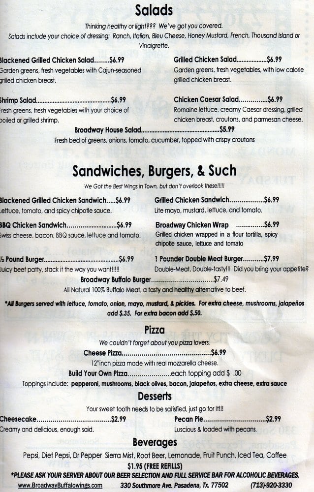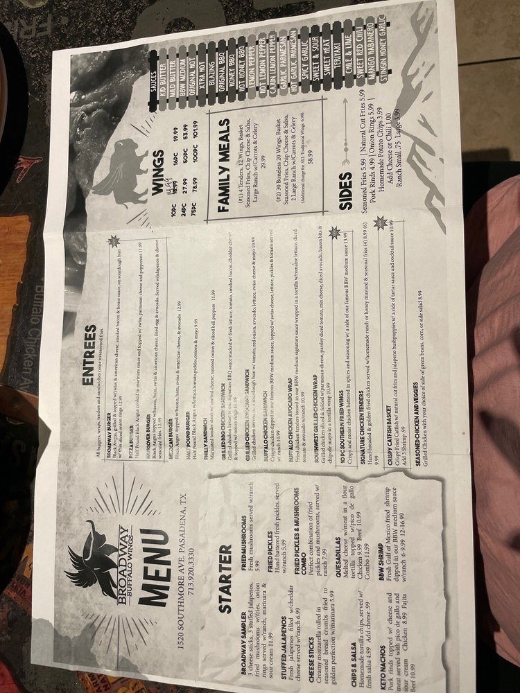 Introducing Broadway Buffalo Wings, located in Pasadena, TX, this American chicken wings spot offers a range of options for both meat-eaters and vegetarians. With features like delivery, takeout, outdoor seating, and a full bar, this casual yet classy restaurant is perfect for groups, families, and even kids. The menu boasts a variety of flavors and sauces for their signature wings, making it a must-visit spot for lunch or dinner. The gender-neutral restrooms, private lot parking, and bike parking ensure convenience for all customers. The moderate noise level and TV screens add to the lively atmosphere of Broadway Buffalo Wings. Be sure to give them a visit and indulge in their delectable wings while enjoying the laid-back ambiance.
